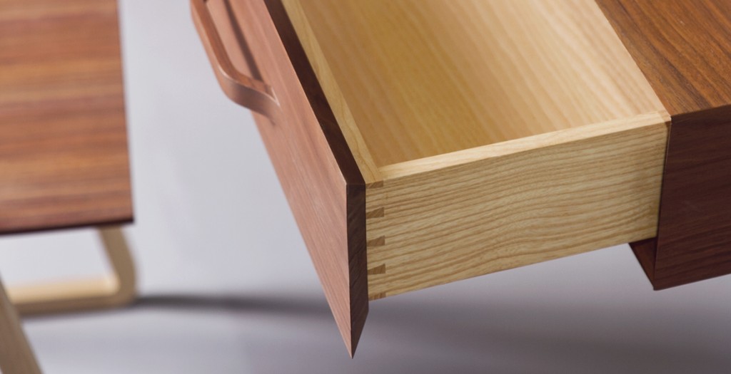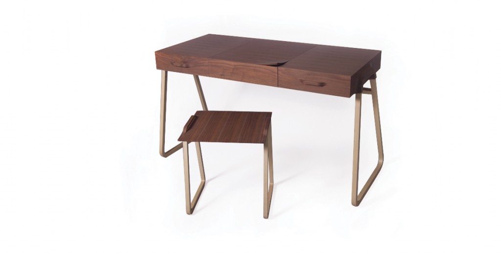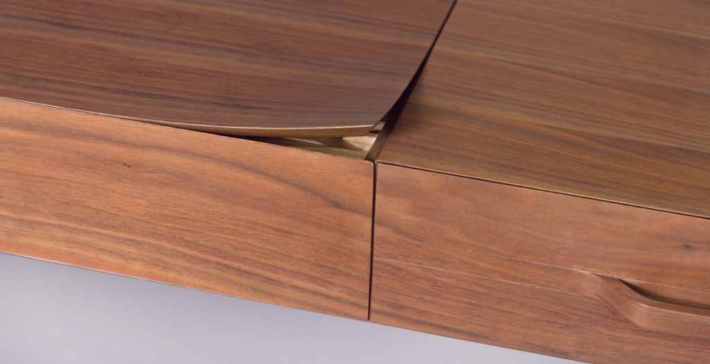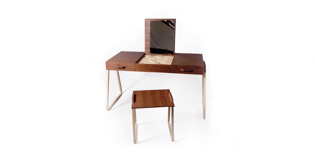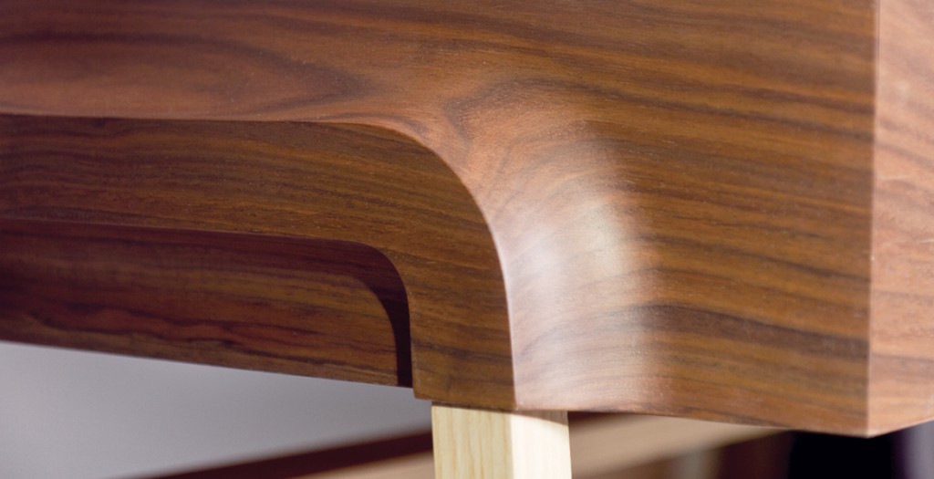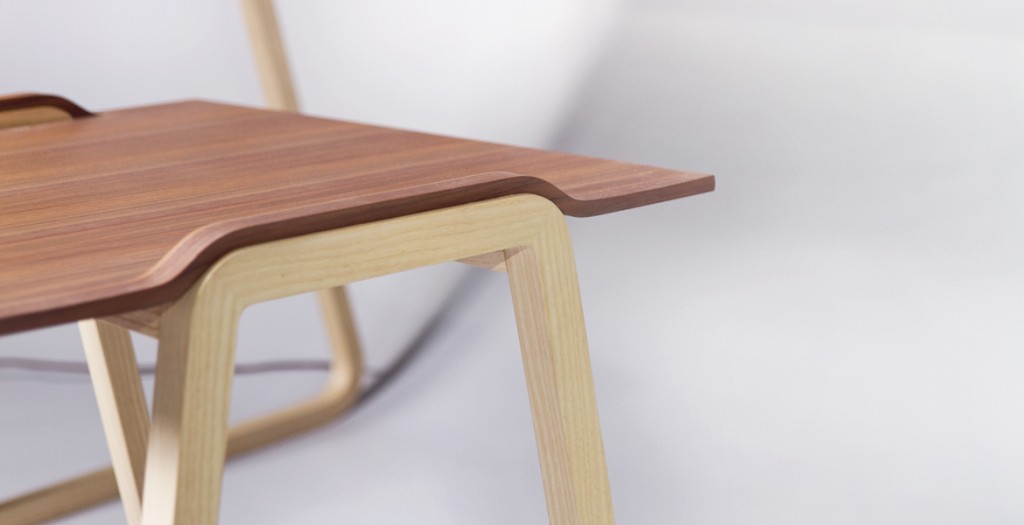 Noyer américain, frêne et aluminium, vernis mat.